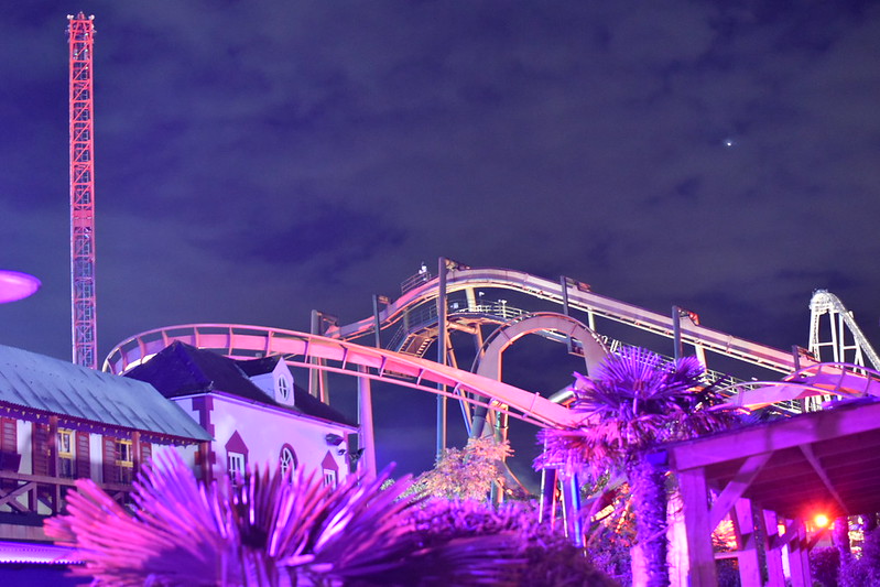 The evening setting transforms Nemesis Inferno into an even more intimidating presence within the park landscape, with strategic lighting accentuating its four inversions and volcano-inspired elements.