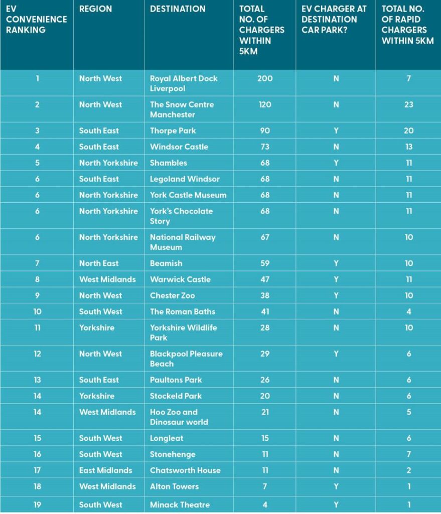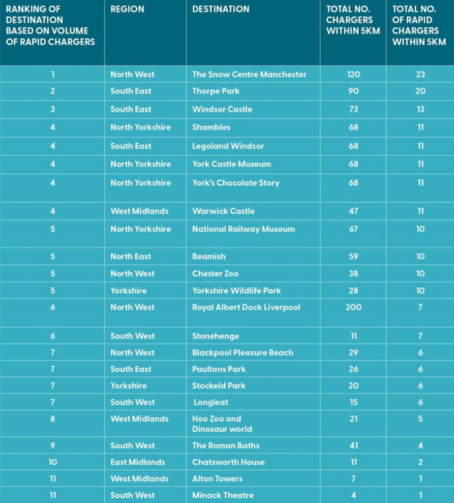 Destinations in London weren’t included due to the large volume of charging points located there, to avoid skewing the data.